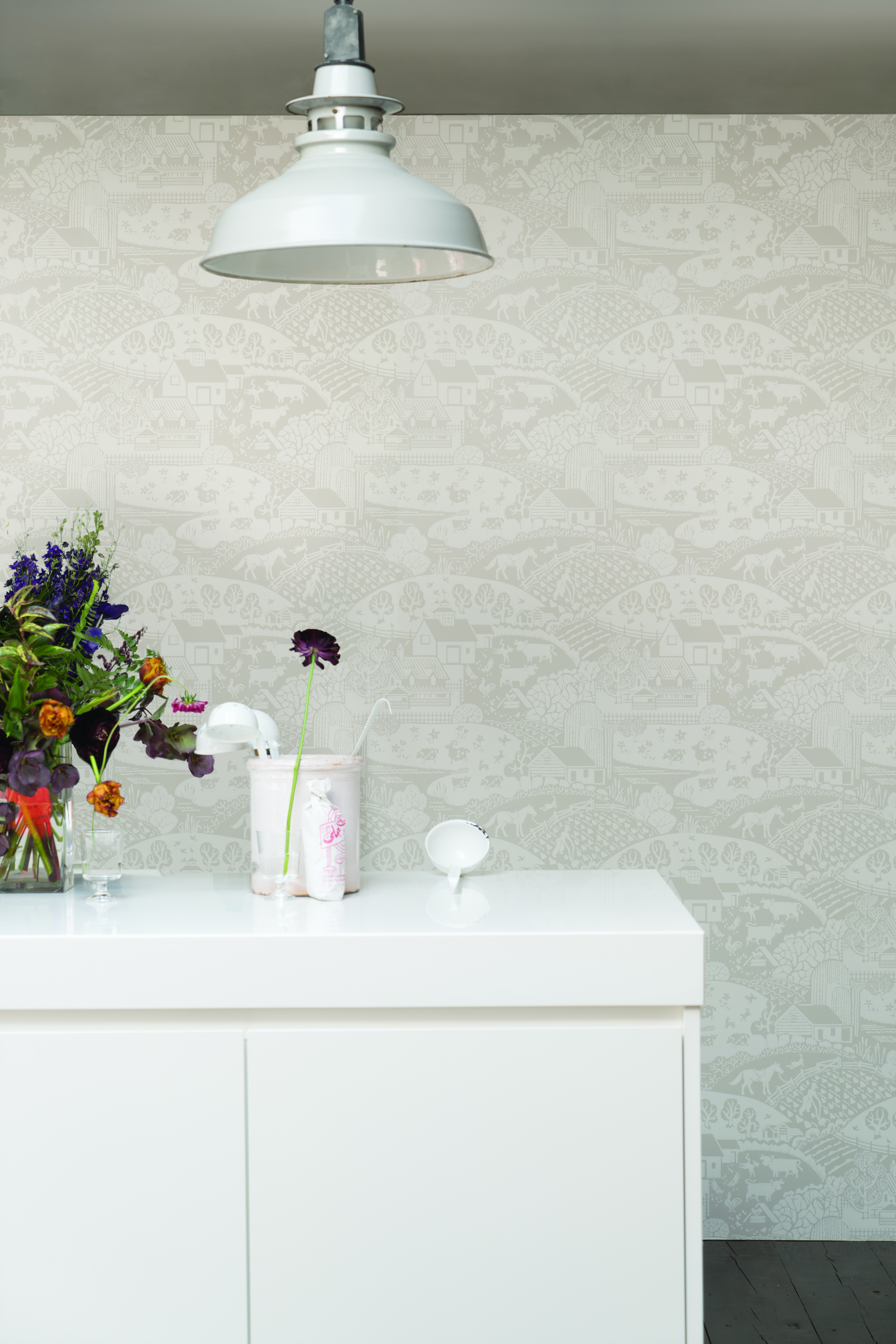 Gagle is playful, pastoral and charming. Atraditional depiction of village and farmyard scenes, it is clean with modern styling. This large scale statement pattern sparks the imagination with it's little details which enhance the character as you view.